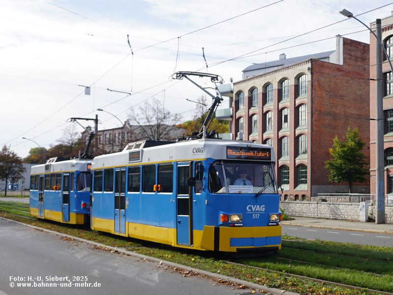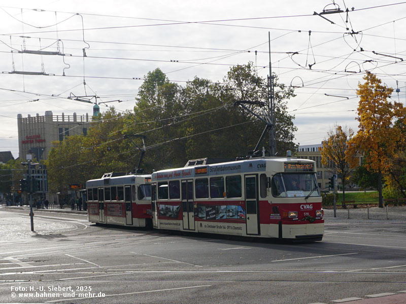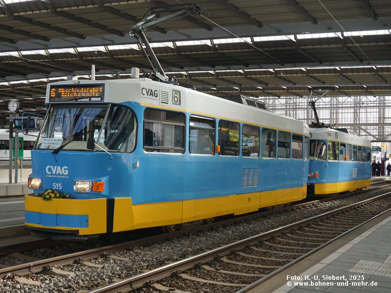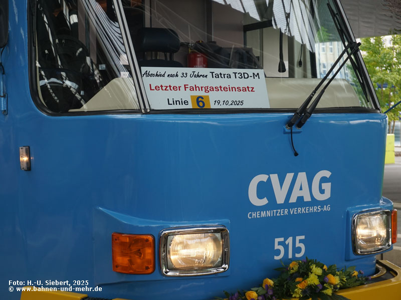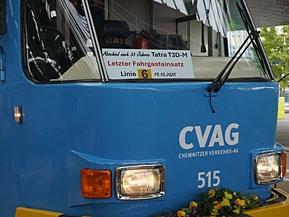 Zum letzten Mal waren in Chemnitz zwei Tatra-Züge bestehend aus T3D-M im Fahrgasteinsatz: #515 und #516 sowie #519 und #509 (im traditionellen Farbschema rot/elfenbein) pendelten auf der Linie 6 Hauptbahnhof - Altchemnitz.