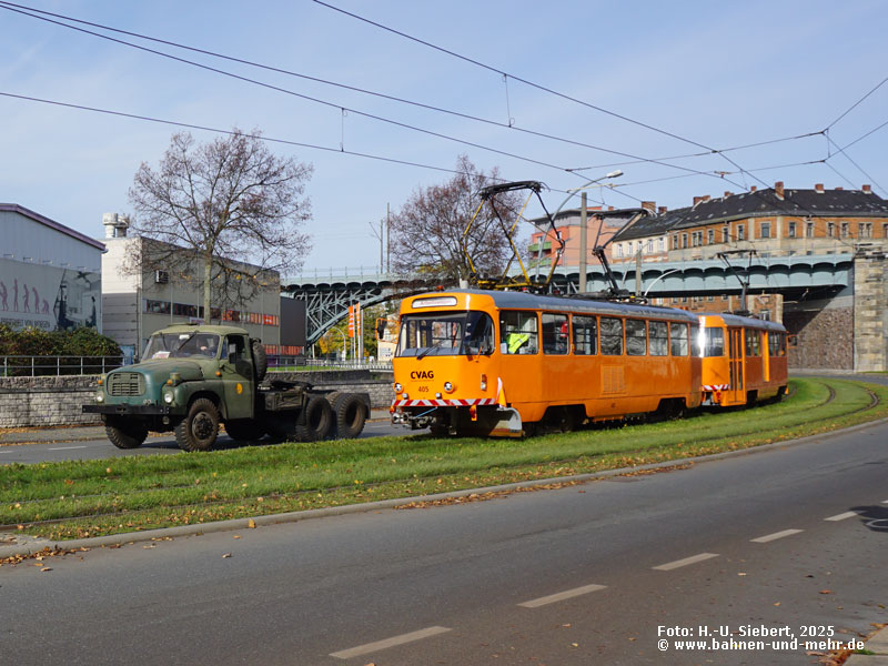 Um die überall am Straßenrand wartenden Fotografen gut zu unterhalten war zwischendurch die CVAG-Fahrschule mit #517 und #507 zu erleben. Auch die ATW #405 und #403 (allerdings beide vom Typ T3D) waren im Heck-an-Heck-Betrieb unterwegs und trafen dabei auf der Annabergerstraße den Oldtimer "Tatra 148".